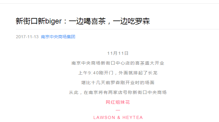 喜茶開業(yè)后的第二天,中央商場新街口店官方微信就創(chuàng)造性的提出了“一邊喝喜茶,一邊吃羅森,一邊逛中央”的概念,此概念一出,使的如今八十多歲的中央商場,一股年輕時尚的氣息撲面而來。